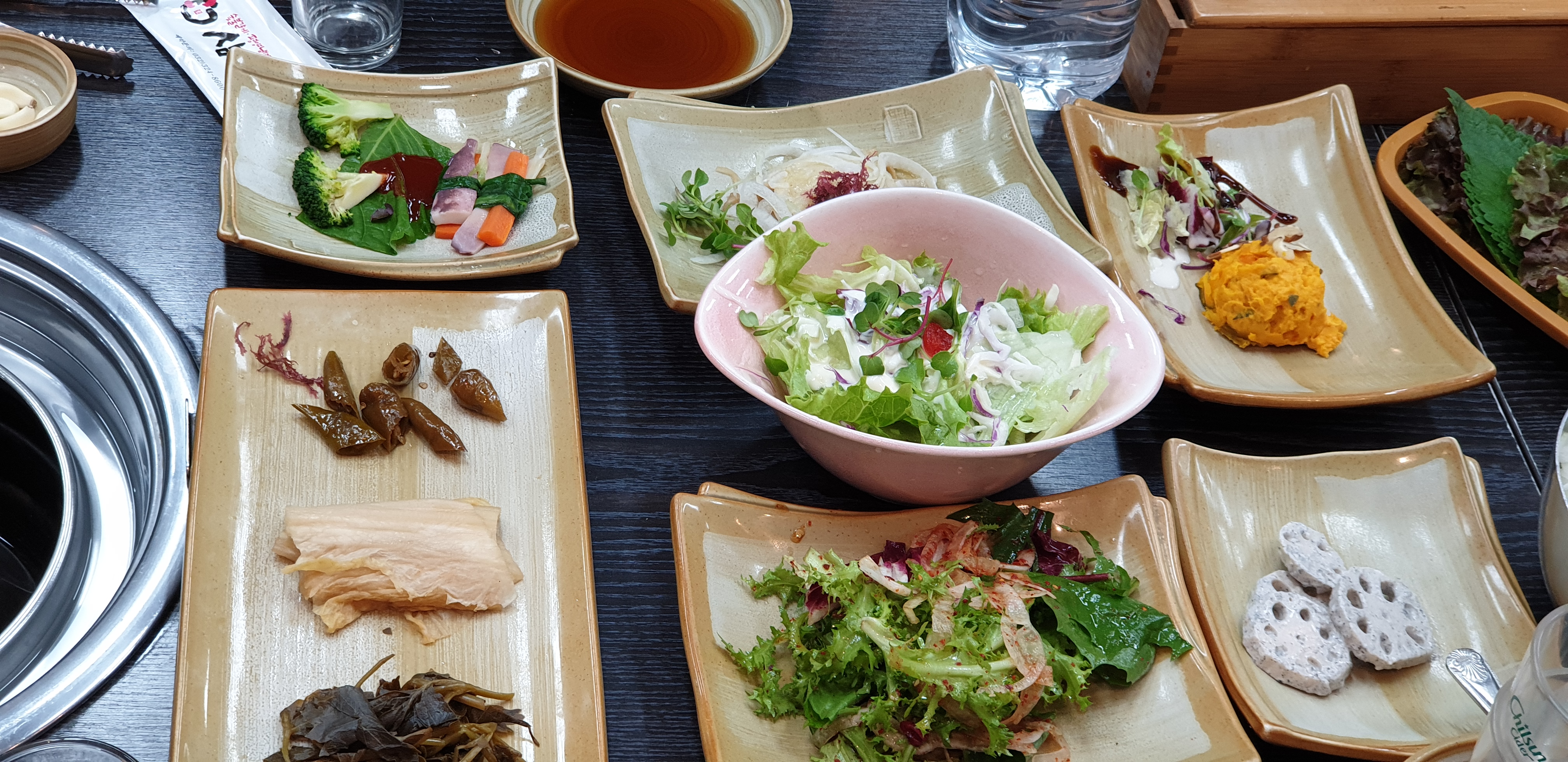 샐러드, 단호박, 브로콜리, 오징어쌈, 고추, 백김치, 연근, 양파 등등
