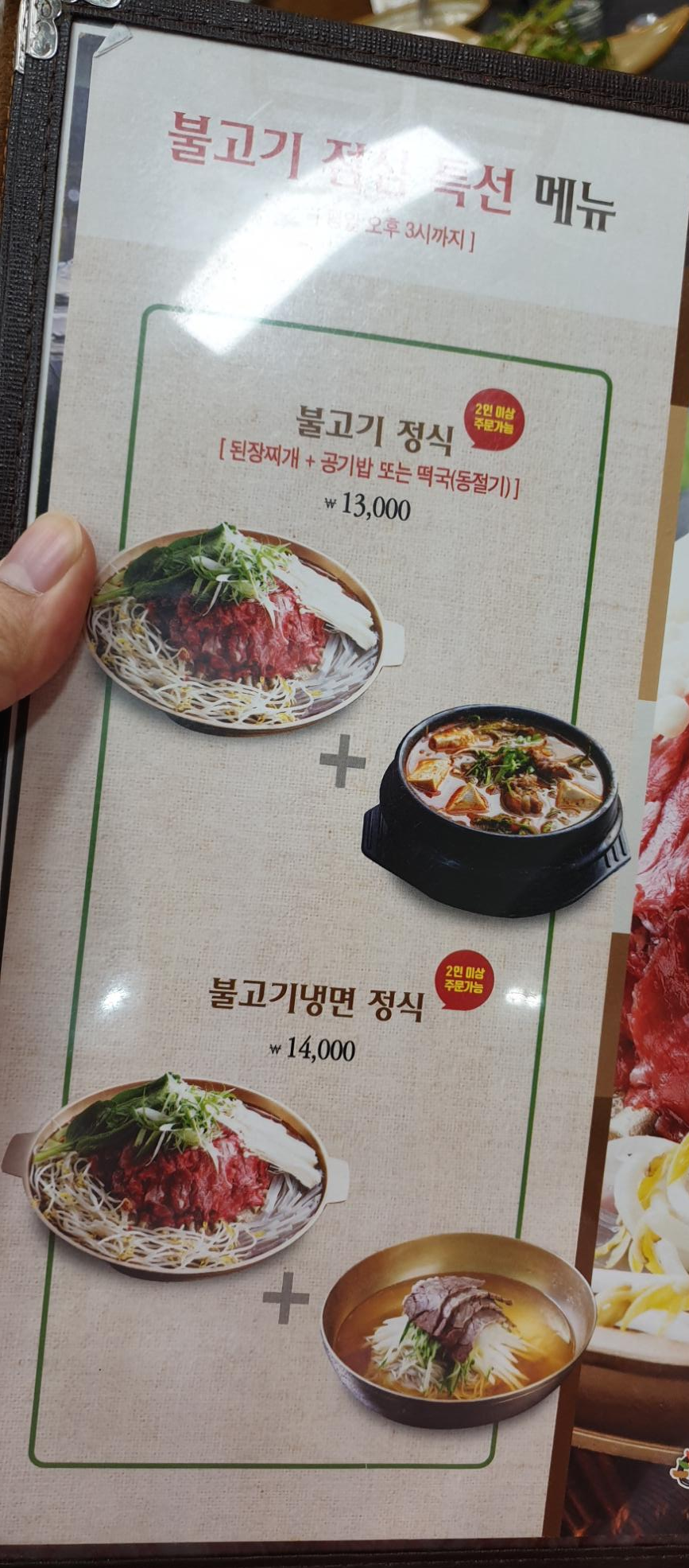 불고기 정식 ( 된장찌개 + 공기밥 또는 떡국 (동절기) ) : 13,000원