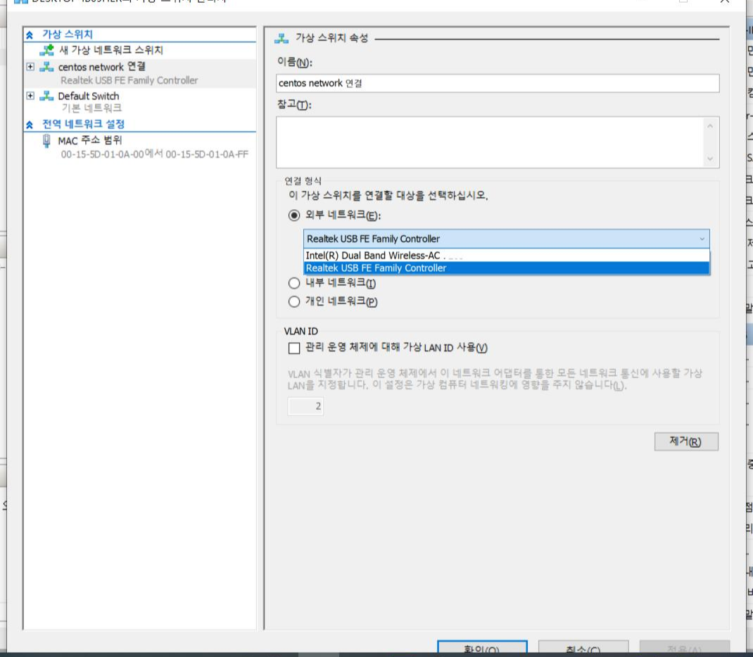 Hyper-v 의 네트워크를 무선랜에서 유선랜으로 변경하여 되는 경우도 있었으니