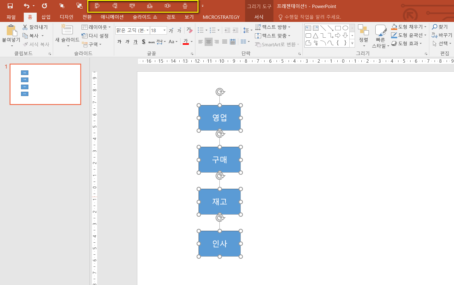 저의 순서는 개체 왼쪽 맞춤 - 개체 오른쪽 맞춤 - 개체 위쪽 맞춤 - 개체 아래쪽 맞춤을 설정하고