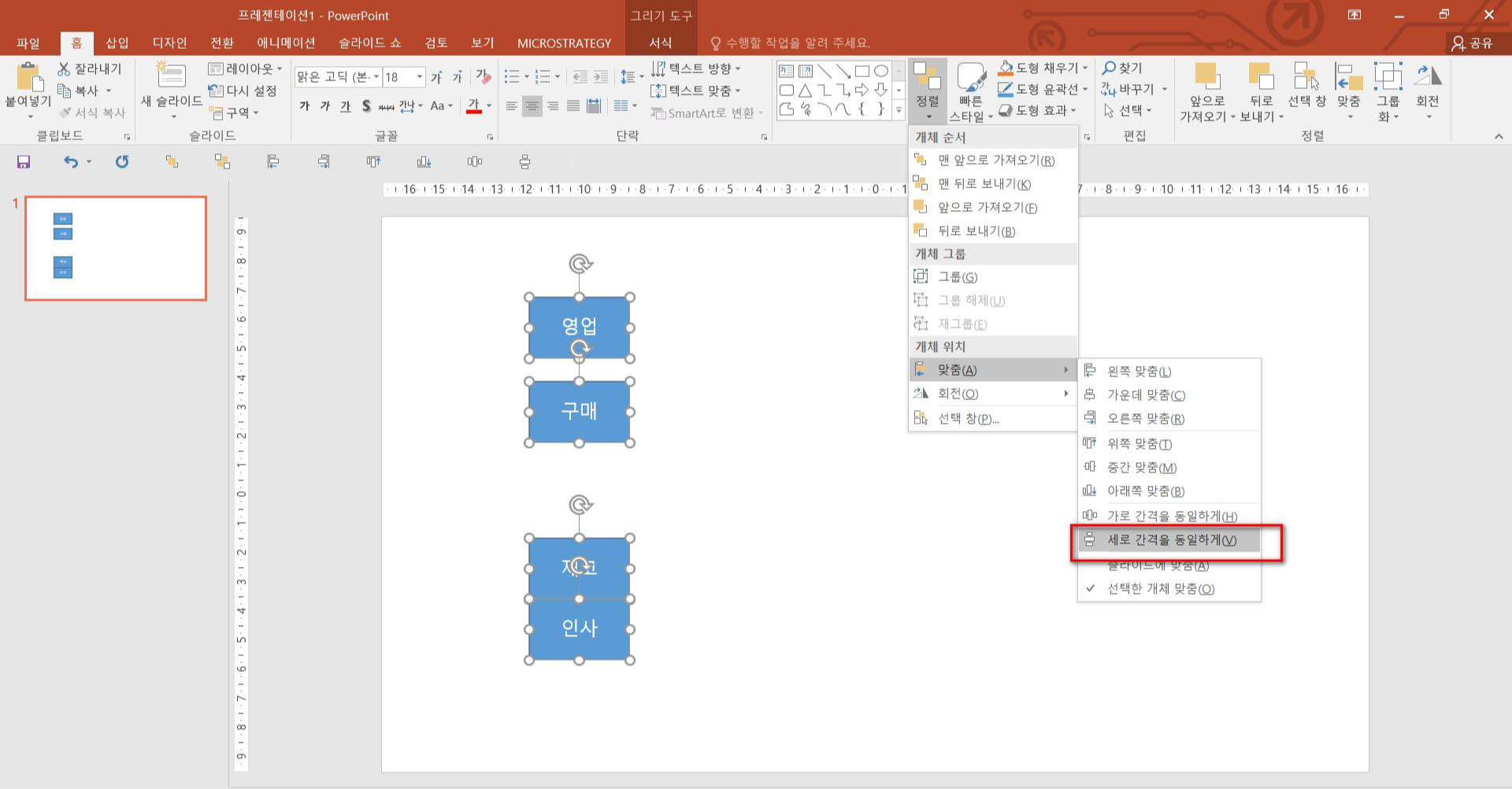 홈 > 정렬 > 맞춤 > 세로 간격을 동일하게