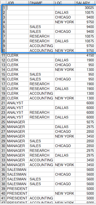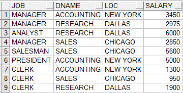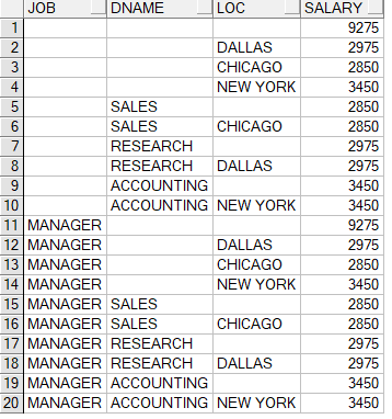 GROUP BY CUBE(T1.JOB, T2.DNAME, T2.LOC)