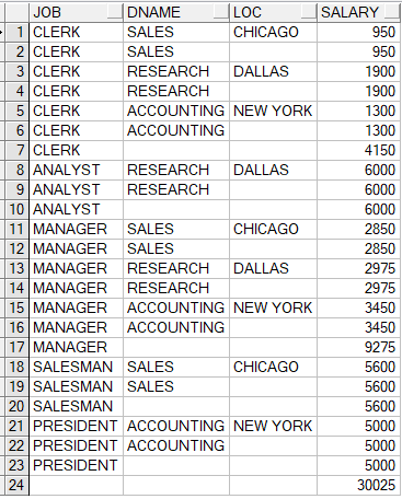 가장 마지막에 JOB과 DNAME과 LOC 의 최종합계값, 즉 ROW DATA 의 전체합계가 조회된 것을 볼 수 있습니다.