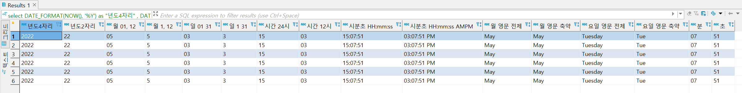 , DATE_FORMAT(NOW(), '%S') as "초"
